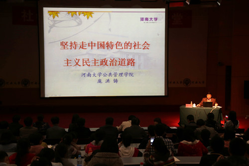 庞洪铸教授在报告中从三个方面对“民主”进行了解读:一是坚持走中国特色社会主义民主政治道路的背景;二是民主的基本理论;三是发展具有强大生命力的社会主义民主政治。他结合香港“占中”问题指出,一方面,当今世界不同文明交流交融交锋呈现新特点,国际思想文化即意识形态领域的斗争深刻复杂;另一方面,我们现在正处于由传统社会向现代社会转型的时期。国内外形势的发展,要求我们必须坚持走中国特色社会主义民主政治道路。他认为民主最实质性的意义,是人民的统治、人民的选择。民主政治在我国社会主义建设和国家建设中具有重要地位和作用。人民代表大会制度是中国人民当家做主的重要途径和最高实现形式。坚持和完善人民代表大会制度,要做到“四个必须”:必须毫不动摇坚持中国共产党的领导;必须保证和发展人民当家做主;必须全面推进依法治国;必须坚持民主集中制。