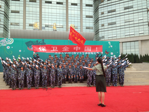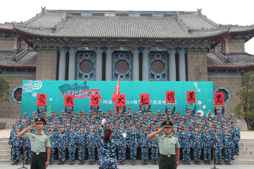 9月13日,校团委筹办的河南大学2014级学生“绿色与青春”军训歌咏比赛在明伦校区大礼堂广场和金明校区明德广场同时进行,来自两个校区的共82个连队万余名同学参加。相关部门及艺术学院等单位老师担任评委及仲裁。