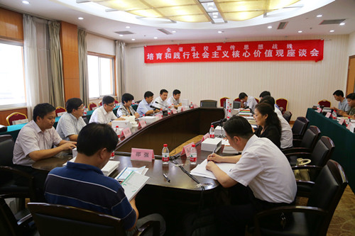 2014年8月19日,在习近平总书记8•19重要讲话发表一周年之际,全省高校宣传思想战线培育和践行社会主义核心价值观暨《河南高校思想政治工作管理论丛》发行座谈会在我校金明校区召开。来自全省部分高校的党委副书记、宣传部长、学工部长及马列部主任齐聚一堂,畅所欲言,碰撞思想,启迪思维。省教育厅思政处处长何秀敏出席会议。会议由我校党委宣传部部长李庆春主持。