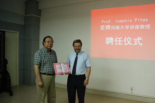 6月16日上午,希腊亚里士多德大学(Aristotle University of Thessaloniki)Ioannis Pitas教授受聘我校讲座教授聘任仪式在计算机与信息工程学院302会议室举行。常务副校长赵国祥出席,人事处处长刘先省、计算机与信息工程学院全体领导班子成员及Pitas教授指导的科研小组参加了聘任仪式。仪式由刘先省主持。