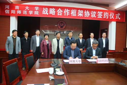 关爱和回顾了我校与信阳师范学院的历史渊源。他说,河南大学和信阳师范学院同根同脉,血肉相连,双方有着深厚的感情基础。依托学科基础和丰富的经验,双方可以以一些具体项目作为纽带,建立起广泛而深入的合作。他希望双方在今后的合作中构建运转有效的工作机制,深入推进优质创新资源的共享,共同着力打造中原地区高等教育新高地,为河南高等教育和经济社会发展、为中原经济区建设做出新的更大的贡献。