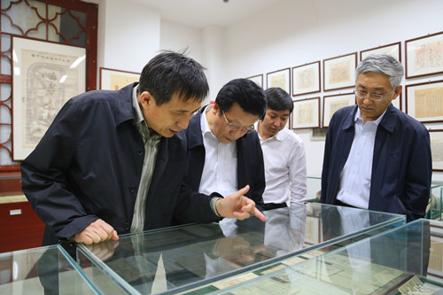 在位于六号楼的古代科举书院文化展展出现场,和古代科举相关的一张张试卷和一件件文物吸引了张平的目光,“河南大学竟然有这么一个好地方!”张平赞叹道。参观过程中,关爱和向张平一行介绍了我校的历史沿革、特别是中国古代科举制度在我校终结的情况。之后,张平一行考察了文物馆、明伦校区近代建筑群,并走进我校标志性建筑大礼堂详细查看了其内部结构、建筑特点,对我校悠久的办学历史、深厚的文化底蕴给予了高度评价。