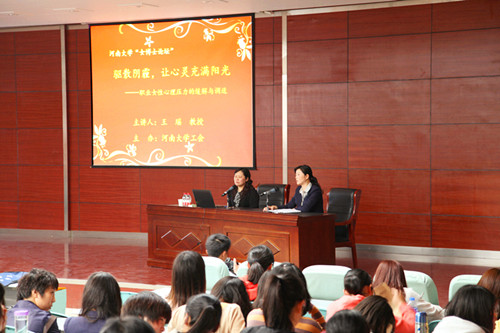 3月27日下午,由校工会主办的“女博士论坛”在金明校区生命科学学院报告厅举行。教育科学学院王瑶教授作了题为“驱散阴霾,让心灵充满阳光—职业女性心理压力的缓解与调适”的讲座。各基层工会女工委员、女教职工生代表300余人与会。论坛由校工会副主席、女工委员会主任宋菊芳主持。