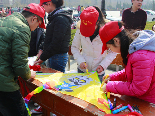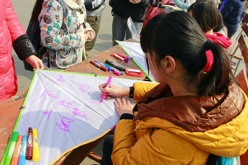 “自古来就有三月放纸鸢的传统,拿起彩色的马克笔,一起来书写绿色愿望和青春宣言吧。”学生只要储蓄10元“绿色基金”,就可以领取风筝材料,动手绘制独一无二的风筝。“希望全国的雾霾天越来越少”、“世界要更和平”、“绿植快快长大啊”……承载着各种愿望的风筝在蓝天中飞翔。