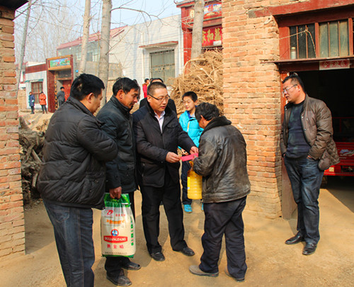 在马年新春佳节即将来临之际,为深入做好扶贫开发工作,践行党的群众路线,把关怀和温暖送到贫困村贫困户,让困难群众过一个愉快、祥和的春节,2014年1月25日上午,我校扶贫工作队一行来到开封市兰考县仪封乡东老君营村,对村中贫困户进行慰问,为困难群众送去温暖。