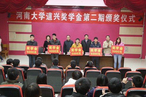 2014年1月9日下午,河南大学道兴奖学金第二期颁奖仪式在明伦校区科技馆一楼报告厅举行。河南兴亚集团执行总裁张会元、我校副校长邢勇及教育发展基金会、学生处相关负责人出席仪式。仪式由学生处处长周保平主持。