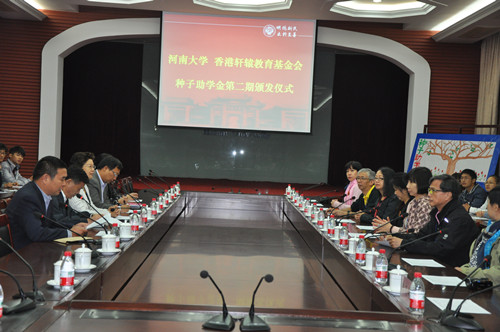 10月16日上午,香港轩辕教育基金会终身荣誉会长何敏坚女士率基金会部分成员来到河南大学,在小礼堂向受助学生颁发第二期种子助学基金。党委统战部、学生处、教育发展基金会等相关部门负责同志参加了仪式。仪式由党委统战部副部长史富强主持。