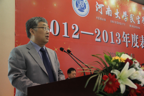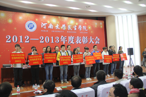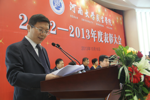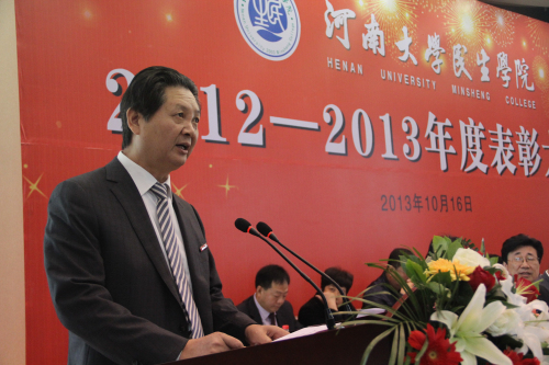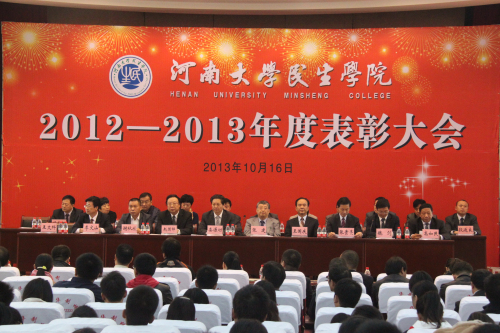 10月16日上午,民生学院2012-2013年度表彰大会在该院多功能报告厅隆重举行,以这种方式热烈庆祝学院十年华诞。河南日报报业集团党委副书记、总经理张建,河南日报报业集团副总编辑王国庆,我校校长娄源功,常务副校长赵国祥,民生学院党政领导班子全体成员,捐资助学企业家代表,各地校友会代表,获奖学生代表出席大会。大会由民生学院党委书记魏剑主持。