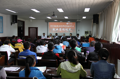 9月25日上午,我校在医学院六楼会议室举行2013年河南省订单定向免费医学生就业协议签约仪式。省卫生厅科教处处长王金河、副处长赵东阳出席,有关单位负责人和省卫生厅有关人员参加签约仪式,医学院2013级49名免费定向医学生参加了仪式。仪式由校招生办副主任田岐立主持。