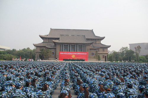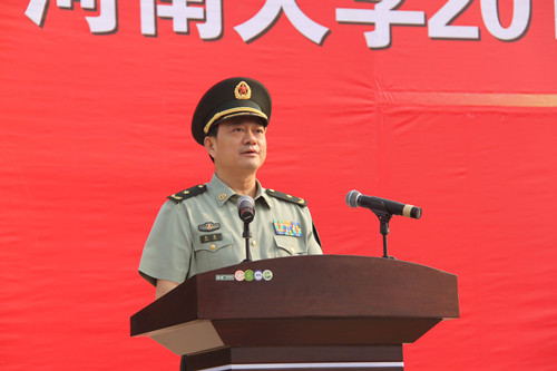 娄源功说,集天下英才而育之,是河大的荣幸;育天下之才而成之,是河大的责任。在100年的办学历程中,河南大学薪火相传、英才辈出,逐渐形成了以“自强不息、百折不挠”为核心的河大精神。娄源功向同学们讲述了河大校友侯镜如追求进步、从事民族救亡运动的故事,分享了校友马可投笔从戎,用音乐支持抗战的故事,并用侯艳丽同学与病魔抗争的感人故事和翟莹求学异国他乡的励志事迹,向新生们具体地诠释了河大精神的深刻内涵。娄源功希望全体新生能够向他们学习,弘扬河大精神,秉承“明德新民、止于至善”的校训,践行“团结、勤奋、严谨、朴实”的校风,牢记使命,在这里成长为一个自强奋斗、百折不挠的河大人。他要求全体新生珍惜军训机会,全身心地投入训练,尊重教官,听从指挥,直面困难,挑战自我,以全新的面貌开始大学生活。