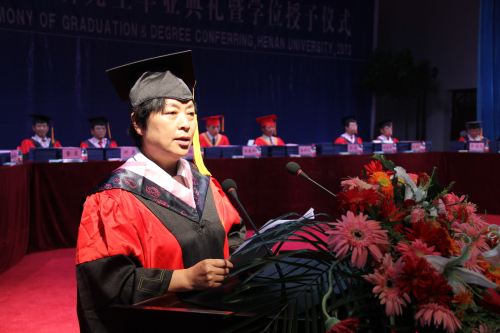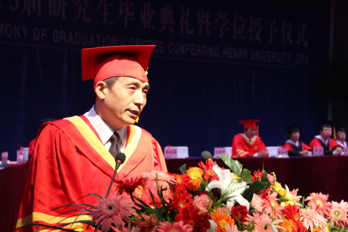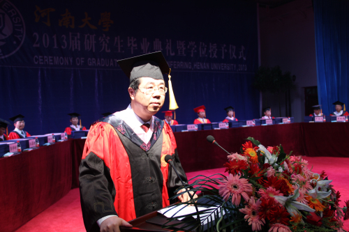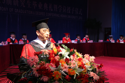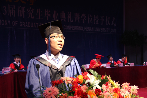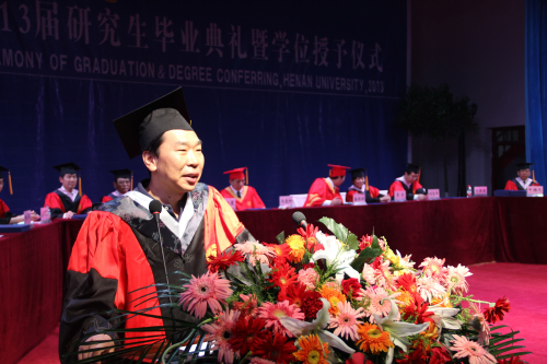 优秀硕士毕业生代表、历史文化学院王兵同学代表全体2013届研究生对母校和老师的辛勤培养表示衷心的感谢,并向母校献上了真挚的祝福。他表示自己和同学们将在未来的人生道路上坚持自己的选择、忠于自己的理想和信念、勇敢面对挑战。博士生导师、黄河文明与可持续发展研究中心执行主任苗长虹代表全体导师向毕业生表示诚挚的祝贺,他希望同学们秉承母校“团结、勤奋、严谨、朴实”的优良校风,明确自己的人生理想,脚踏实地,坦然面对未来,并祝同学们生活幸福、事业辉煌。