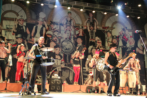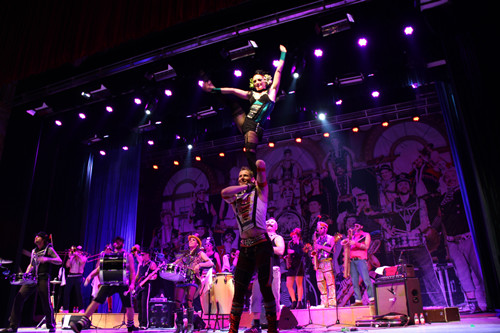 在富有军乐风格的音乐下,演奏会正式开始。在长达2个小时的演出中,“三月四日”管乐团一共带来了17首乐曲。长号、喇叭、萨克斯管……一种种乐器演奏的音符迸发出奇妙神秘的旋律。《塔哒镇》、《蛇5》、《德里肚皮舞》等动感的爵士乐带动了现场氛围。表演期间穿插着高跷、呼啦圈、钢管舞等杂技,钢管舞与高跷的结合更是令同学们叹为观止。同学们舞动双手、欢呼着为乐团喝彩。不同于整场演出激昂、欢快的节奏,《梦魇》一曲被覆盖上了诡异、紧张的气氛,富有故事感的编曲与编舞更是为同学们带来了一场视听盛宴。现场观众积极与之互动,并合着节拍与他们共舞,活跃了演出气氛。该乐队颠覆了传统乐队留给人们的印象,诠释了管弦乐队的新形式、新内涵。