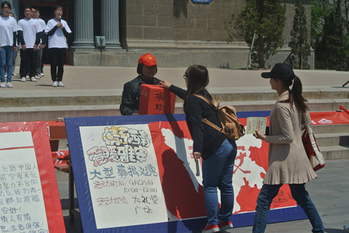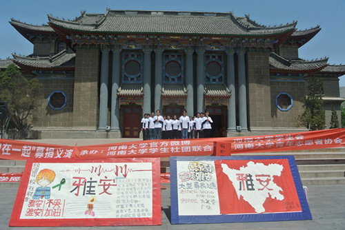为了表达“河大学子心系灾区,全国人民情系灾区”的关切心情,同学们自发组织募捐义演活动。活动伊始,主持人对地震的相关常识做了普及并简要介绍了雅安赈灾的进展。他们用朗诵、合唱等形式来表达对雅安的祝福。灾难无情人有情,青协的同学们用一首《承诺》道出了众志成城救灾的勇气,要扛起身上的责任和道义,一个承诺就是一份担当。新闻与传播学院的同学饱含深情地朗诵《写给雅安》让在场同学为之动容,一方有难,八方支援,表现出了同学们对灾区由衷的祝福。路过义演现场的农民艺术家黄河风先生也即兴为雅安赋诗,短短的几句话却含着浓浓的情。