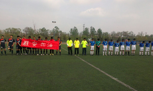 在下午我校组织的河大杯足球赛场上,足球队员们在比赛前,不忘向灾区人民送去温暖,印有“雅安 加油”字样的横幅在微风中愈加鲜艳、夺目。