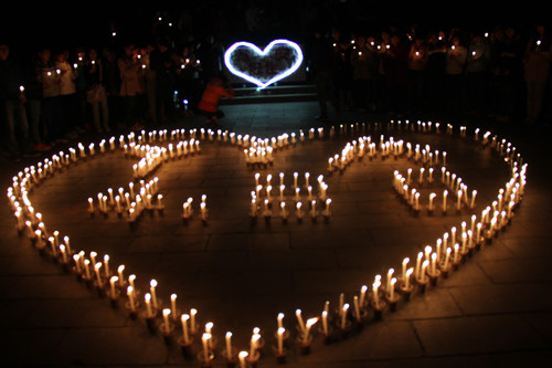 点燃一抹烛光,送上一份祝福。4月20日晚,在雅安地震发生不到12个小时,我校师生在大礼堂前开展了祈福活动。