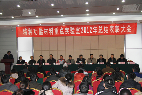 2013年1月5日下午,特种功能材料重点实验室2012年度工作总结表彰大会在我校中州国际金明酒店举行。校党委常务副书记梁晓夏,副校长宋纯鹏,学校相关职能部门以及植物逆境生物学重点实验室有关领导出席会议,并在主席台就坐。大会由实验室党总支书记赵东保主持,实验室全体教职员工及研究生参加会议。