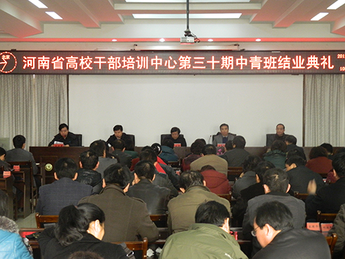 2012年12月11日上午,河南省高校干部培训中心第30期中青年干部培训班举行结业典礼。省委高校工委、省教育厅组织干部处处长高治军,副处长宋辉,校党委常务副书记梁晓夏出席典礼,培训班全体学员及干部培训中心有关同志参加了典礼。