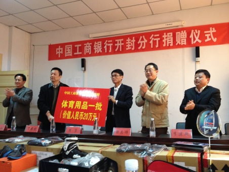 2012年11月19日上午,工商银行开封分行向我校公共体育教研部捐赠体育用品,捐赠仪式在公共体育教研部二楼会议室举行。中国工商银行开封分行行长潘勇,我校党政办公室、教育发展基金会、公共体育教研部,以及工商银行的相关负责人出席仪式。捐赠仪式由我校公共体育教研部党总支书记秦明山主持。