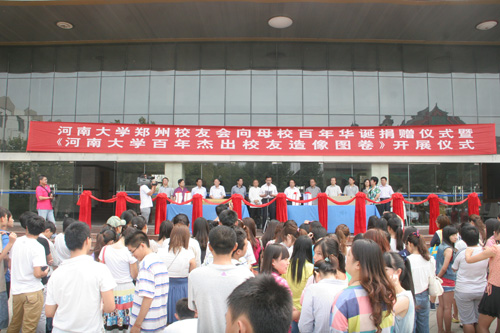 在捐赠仪式上,郑州校友会向我校捐赠了长达百米的“河南大学百年杰出校友造像图卷”及专柜图书1500册,校友回忆录《感恩河大》500册。最后,出席领导与校友会部分成员为“河南大学百年杰出校友造像图卷”展览开展剪彩,作品将自9日始,在我校艺术学院一楼展厅举行为期三天的展览。