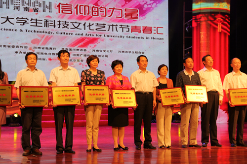 2012年6月19日晚,由中共河南省委宣传部、河南省教育厅、共青团河南省委、河南省文化厅、河南省学生联合会主办的河南省第十三届大学生科技文化艺术节颁奖典礼在河南省人民会堂拉开帷幕。省人大常委会副主任王文超、省政协副主席张亚忠、省委宣传部副部长权红军、团省委书记侯红等领导观看了节目。我校党委副书记王凌在校团委相关负责人陪同下赴郑看望慰问了我校演职人员并观看了演出。