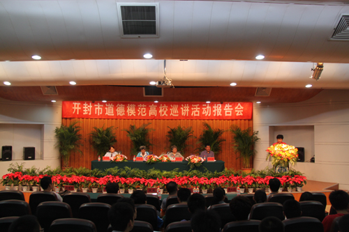 见贤思齐,学习模范崇高;奋发向上,体会道德力量。2012年6月19日下午,我校金明校区行政楼二楼报告厅座无虚席,开封市道德模范高校巡讲活动河南大学报告会在此隆重开讲。巡讲团成员为河南省第三届道德模范提名奖获得者李玉萍;中国好人榜上榜者王军华、张庆禄;中国好人榜候选人、开封市顺河区道德模范刘传真。校党委副书记王凌,市文明办、校党委宣传部等相关负责人,开封市部分新闻媒体出席活动,与来自学校各学院、各学生社团300余名师生代表一起聆听了此次报告。报告会由校党委宣传部部长李文山主持。