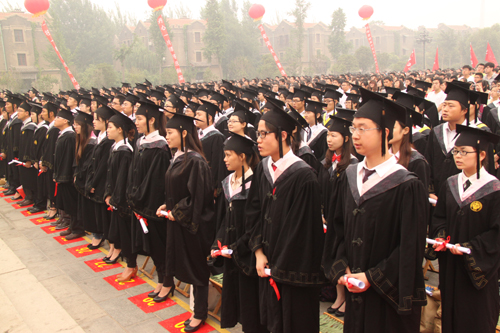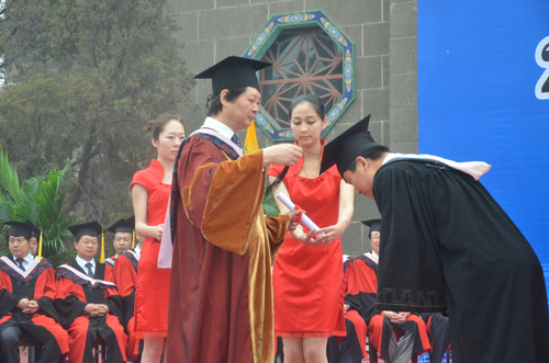 校长娄源功为荣获河南省优秀毕业生称号的同学颁发学士学位证书,并为他们一一援正流苏,合影留念。