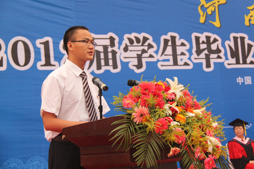 优秀毕业生代表、国际教育学院刘怡盈同学代表全体毕业生向母校和老师表达了深深的感激留恋之情,并表示要用自己的实际行动传承河大精神与铁塔品质,做胸怀大志、脚踏实地、勇于担当的河大学子。在校生代表、校学生会主席王振同学代表全体在校生向学长学姐们献上最诚挚的祝福,祝愿他们在未来的道路中前途似锦,为母校争光。教师代表、外语学院博士生导师牛保义教授代表全体教师和校友祝贺同学们顺利完成学业,希望他们毕业后努力做志存高远、求真务实、宽宏大量、知恩图报的人,并祝福他们在告别母校、踏上新的工作岗位后一帆风顺。