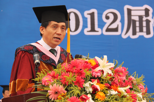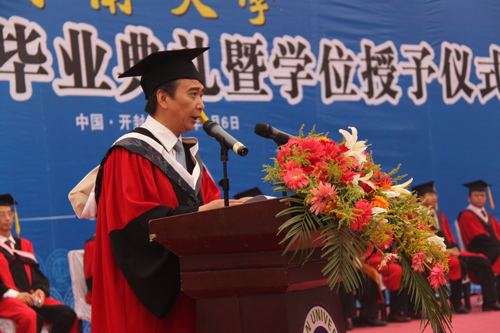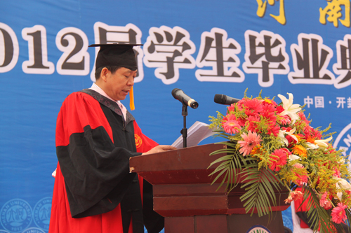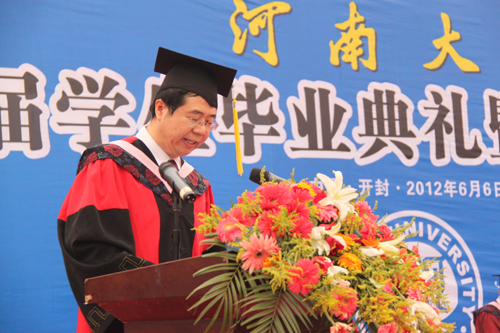 校党委书记关爱和代表学校向圆满完成学业、顺利毕业的2012届毕业生表示最热烈的祝贺和最美好的祝福。他说,2012届毕业生是值得骄傲和自豪的,与母校一起走过了将会载入河南大学史册的四年。2008年,学校顺利进入省部共建高校行列;2009年,我校胜利召开第九次党代会,描绘了未来一个时期学校发展的宏伟蓝图;2010年,我校在郑东新区建立新校区,几代河大人的梦想变了现实。2011年,“支持河南大学创建国内一流大学”写入了国务院文件,省政府也印发了《百年名校河南大学振兴计划》。临行惜别,他对广大毕业生提出三句赠言:一是希望同学们能够学会在知识经济时代生存,在大学学习到的知识的基础上,深度更新知识储备,提升自身创新能力,努力成就一番属于自己的事业。二是希望同学们牢记“百折不挠”的河大精神,在人生道路遇到曲折和艰辛时,秉承母校精神,努力坚持走下去。三是希望同学们牢记母校永远是大家的港湾,希望各位飞得更高更远,也希望同学们常回家看看。