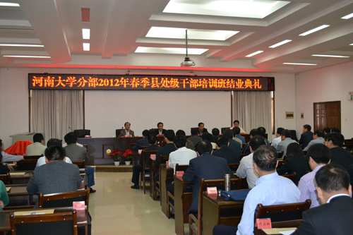 2012年4月27日上午,省干部教育培训中心河南大学分部2012春季县处级干部进修班结业典礼在干部培训中心举行。校党委常务副书记梁晓夏出席结业典礼,县处级干部进修班70余名学员及党委组织部、干部培训中心有关同志参加了结业典礼。
