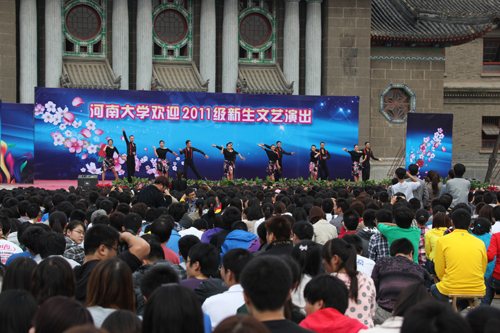 10月13日下午,由学生工作部主办的“金秋礼赞”——河南大学欢迎2011级新生文艺演出分别在明伦校区大礼堂广场和金明校区马可广场举行。校党委副书记王凌及学生处、校团委有关负责人观看了演出。