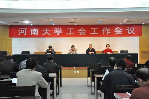 会上传达了《中共河南大学委员会转发校工会< 关于召开河南大学第十七届教职工暨工会会员代表大会第一次会议实施意见>的通知》,并对《关于对基层工会“教工小家”考核验收的通知》、《关于河南大学2011年下半年教职工体育比赛安排的通知》和《关于举办河南大学2011年教职工健身操、舞比赛的通知》等具体工作进行了安排。