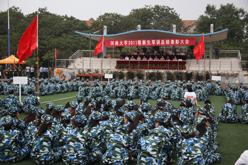 旌旗指北更戎装,凯歌健步抒豪情。9月16日下午,我校2011级新生军训总结表彰大会在明伦校区东操场隆重举行。校领导娄源功、王凌、关学增,中国人民解放军信息工程大学副校长赵满建少将、开封军分区副司令员侯敬民大校、河南大学军训领导组成员及相关部门负责人出席会议。大会由校党政办主任许绍康主持。