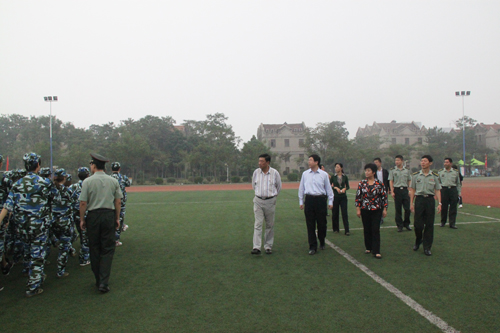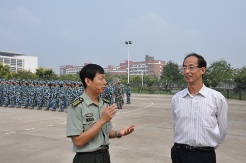 2011年9月9日,校党委副书记王凌,副校长关学增、刘志军在承训部队首长和学校相关职能部门负责人的陪同下,到新生军训现场检查指导工作,并看望和慰问承训官兵和受训新生。