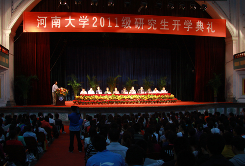 校长娄源功发表了热情洋溢的讲话,他代表学校对2011级新同学的到来表示热烈的欢迎和衷心的祝贺。他说,河南大学即将迎来百年校庆,同学们的到来为学校输入了新鲜血液。他向同学们提出了三点要求:一、遵循精英教育传统,明确学习目标。要以前辈学人为榜样,在踏实的求学过程中,体味智慧之乐,体验人生之真;切实秉承“明德新民,止于至善”的校训,在学与问的过程中,不断感悟和提升学术研究的品味,将自身塑造为知行并重的学问人。二、要在创新上下大功夫,在科研上充满热情。要学用兼立、学思并举,充分发挥想象力,将学习和思考结合起来,将学习和研究结合起来,将学习和实践结合起来,不断开拓创造意识与能力;三、崇尚学术,诚信做人。保持心灵的纯净,真正把学历转变成能力,把知识转变成贡献。娄源功要求全校研究生导师要充分发挥研究生的综合能力,培养其多方面的科研能力,为今后的发展夯实基础。