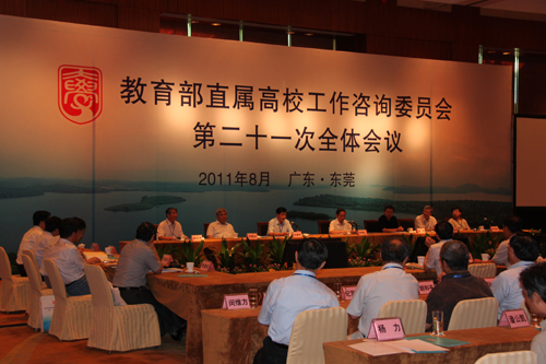 2011年8月14日到15日,教育部直属高校工作咨询委员会第二十一次全体会议在广东东莞举行。中共中央政治局委员、国务委员刘延东出席会议并作重要讲话,教育部部长袁贵仁,教育部党组全体成员及各司局主要负责同志,中央组织部、国务院办公厅、发改委等相关部门负责同志,以及77所部属高校、59所地方“211” 工程和省部共建高校、10所特邀高校主要领导及有关人员共300余人参加了会议。我校校长娄源功应邀参加,并以小组召集人的身份在大会上发言。