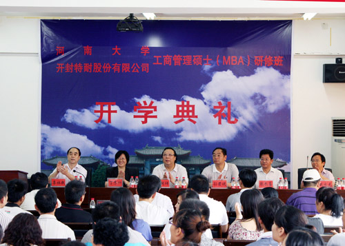 7月30日,开封特耐股份有限公司工商管理硕士(MBA)研修班开学典礼在我校工商管理学院六楼学术报告厅举行。我校常务副校长赵国祥及研究生院有关负责人,开封特耐股份有限公司董事长张长喜及公司有关负责人,工商管理学院、河南大学MBA教育中心相关负责人和研修班学员参加了典礼。典礼仪式由工商管理学院党委书记李社教主持。