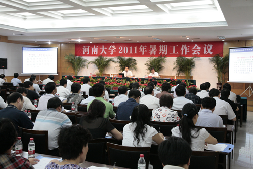 2011年7月8日上午,为期3天的河南大学2011年暑期工作会议在明伦校区新办公楼第四会议室拉开序幕。全体校领导,全体正处级干部,副处级单位主要负责人,校学术委员会各学部学术委员会委员与会。校党委常务副书记梁晓夏主持会议。