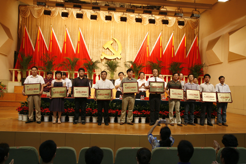 全体起立,奏国歌后,常务副校长赵国祥宣读了学校党委的表彰决定。出席会议的校领导为受表彰的先进党支部标兵、优秀共产党员标兵、优秀党务工作者标兵颁发了象征荣誉的奖牌和证书,会场响起了热烈的掌声。