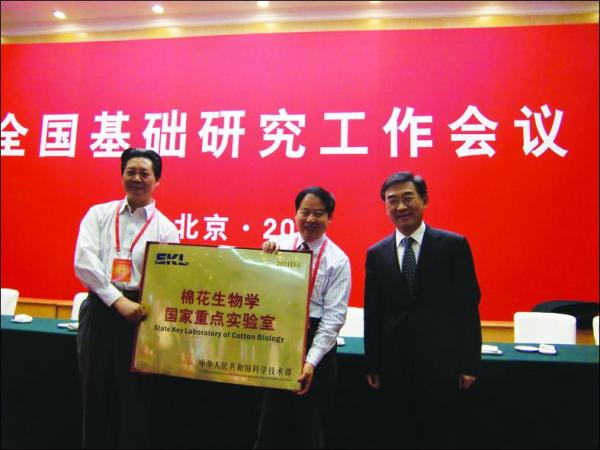 2011年5月23日,由科技部、教育部、中科院等共同主办的全国基础研究工作会议在北京召开。在这次会议上,科技部党组副书记、副部长王志刚宣布了关于新建国家重点实验室文件及部分会上授牌国家重点实验室名单。校长娄源功作为国家基础研究基地特邀代表参加了会议,和中国农业科学院棉花研究所所长喻树迅一道接过了“棉花生物学国家重点实验室”标牌。