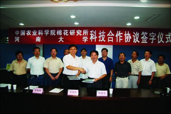 2008年8月23日,河南大学与中国农业科学院棉花研究所在安阳签署科技合作协议。根据协议,双方将发挥各自的学科优势,进一步凝练研究方向,联合申报和承担国家重大科技项目和科研课题;积极组织安排相关研究人员在棉花生物学基础理论研究方面进行联合攻关,解决棉花产业发展中面临的安全、质量等一系列重大科学问题,实现棉花产量、品质与抗逆性同步提高;此外,双方在研究生招生、联合培养方面也达成了积极的共识。