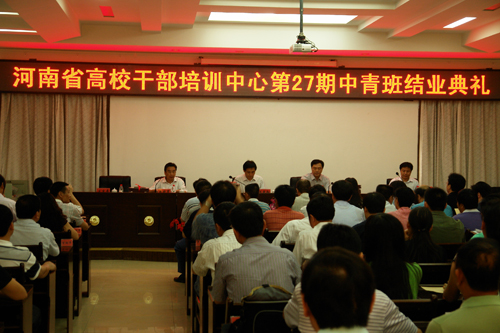 2011年6月8日上午,河南省高校干部培训中心第27期中青班结业典礼在我校举行。省委高校工委副书记张亚伟,省委高校工委、省教育厅组织干部处副处长宋辉,校党委书记关爱和,校党委常务副书记梁晓夏出席结业典礼,干部培训中心有关同志及培训班全体学员参加了典礼。