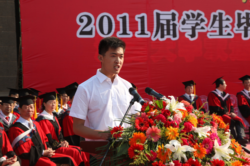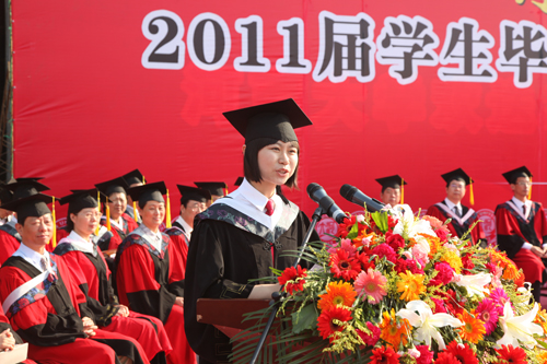 护理学院2011届优秀毕业生李曼代表全体毕业生感谢各位领导和老师四年来的辛苦培育与默默关怀,今后将带着对母校的美好祝福,在工作学习中努力实现自身价值,为母校增光添彩。在校生代表、学生会主席高石鑫代表全体在校生表达了对学长们的衷心祝愿,表示要以他们作为在学习生活中的榜样,用青春续写河南大学新的篇章。化学化工学院院长、博士生导师牛景杨作为教师代表向毕业生同学致以祝贺,希望他们在踏上新征程时,带着老师们的殷切祝福,心怀梦想,在保证一个好身体的同时,养成良好的合作精神和终身学习的习惯,成就似锦前程。