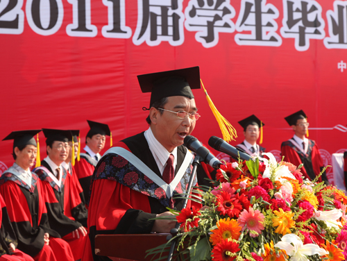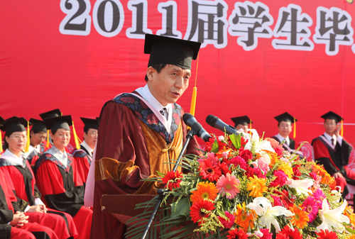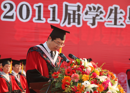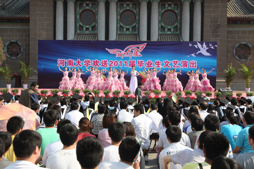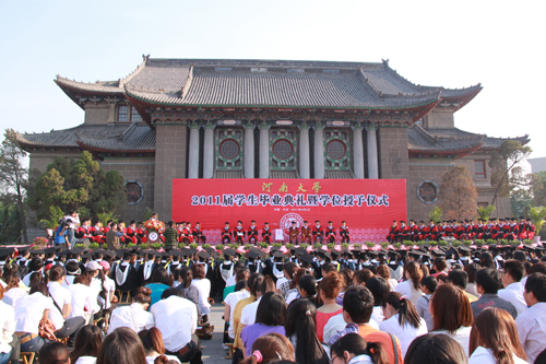 百年河大培育桃李,万千学子扬帆起航。2011年6月3日上午,来自我校各学院的九千余名毕业生齐聚明伦校区大礼堂前广场,参加河南大学2011届学生毕业典礼暨学位授予仪式。全体校领导及各部门负责人、各院导师代表出席典礼。毕业典礼由校党委常务副书记梁晓夏主持。