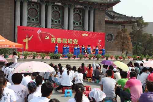“经典红歌展示九十年画卷,青春旋律点燃你我豪情,”5月28日上午,我校明伦校区大礼堂广场歌声飞扬,激情洋溢。由校团委主办的周末文化广场——“青春献给党”暨河南大学纪念建党90周年校园红歌会在这里隆重举行。校党委宣传部、学生处、校团委及各院团委相关负责人出席活动,近千名师生观看此次演出。