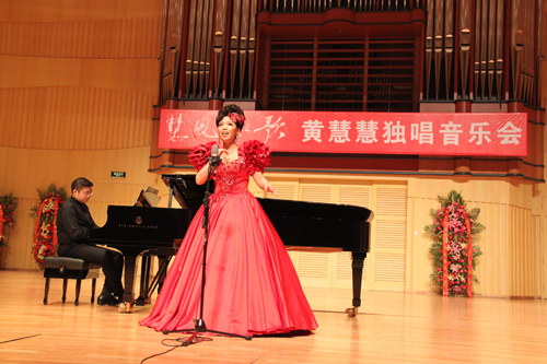 华灯初上,郑东新区河南艺术中心被鲜花和观众簇拥,音乐会尚未开始,乐厅已座无虚席。《姑娘十七八》、《蛤蟆洼》等河南民歌的合唱拉开了音乐会的序幕。黄慧慧神情淡定地走上舞台,面对台下的数百观众,用动人的嗓音演绎歌曲《飞天》,清晰的吐字、柔美的音韵、投入的眼神、典雅的气质,一下子把观众带入了音乐的世界。