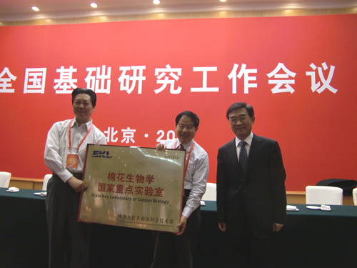 会议以“繁荣基础研究,建设创新性国家”为主题,总结近十年来我国基础研究的成绩和经验,科技部党组副书记、副部长王志刚宣布关于新建国家重点实验室文件及部分会上授牌国家重点实验室名单,我校和中国农业科学院棉花研究所联合建设的“棉花生物学国家重点实验室”是河南省依托高校建设的第一个国家重点实验室,也是本次授牌的国家重点实验室之一。