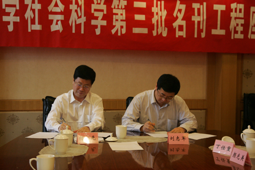 我校副校长刘志军作了名刊建设方案的汇报。他说,名刊之“名”在于有独特的办刊思想和学术风格,在于能为学术界源源不断地提供新的学术思想,在于成为引领学术发展的旗帜。《史学月刊》将以进入名刊工程为起点,进一步重视期刊工作,重视稿件的思想性、学术性和创新性,强调规范性以及学风文风的严谨性,及时掌握学术动态,将《史学月刊》推向更高的层次,以推动学术研究和教学的长远发展。随后,刘志军代表河南大学与杨光共同签订《名刊工程建设协议书》。