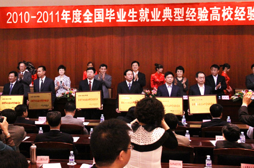 2011年5月10日上午,2010—2011年度全国毕业生就业典型经验高校经验交流会在北京召开。教育部党组副书记、副部长杜玉波出席会议并讲话,教育部党组成员、部长助理林蕙青宣读获得全国毕业生就业典型经验高校名单,来自全国21个省(市、区)50所年度就业典型经验高校负责人、部分省市毕业生就业指导机构负责人等参加了会议。副校长刘志军代表我校接受颁奖。