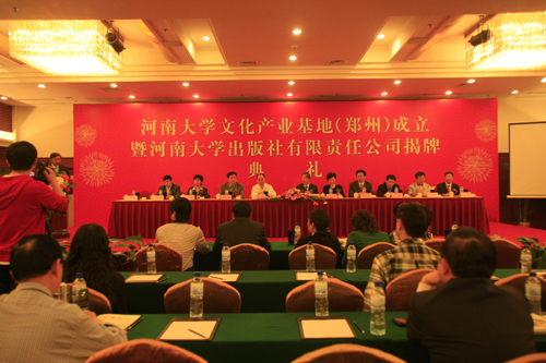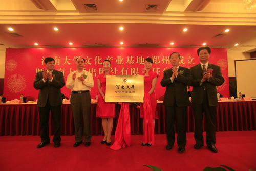 2011年4月28日上午,河南大学文化产业基地(郑州)成立暨河南大学出版社有限公司揭牌仪式在郑州中州假日酒店举行。省人大常委会副主任、省委高校工委书记蒋笃运,省委宣传部副部长李宏伟,省新闻出版局局长詹玉荣,省委高校工委副书记张亚伟,中原出版传媒集团副总裁李永臻,河南报业集团党委副书记、总经理张健,大河报总编辑王守国,校领导娄源功、王凌、宋纯鹏等出席揭牌仪式。揭牌仪式由副校长宋纯鹏主持。
