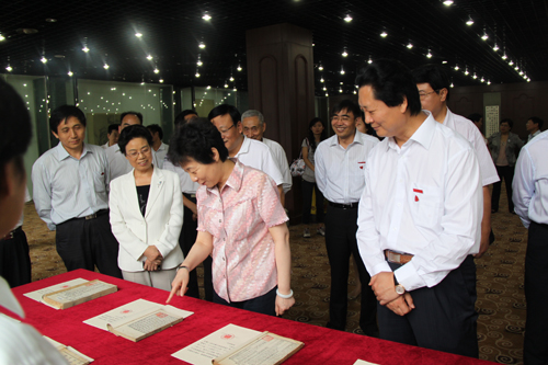 在校领导关爱和、娄源功、宋纯鹏等陪同下,严隽琪首先来到金明校区图书馆,听取了图书馆有关负责同志的介绍,考察了我校珍藏的古籍图书字画,对我校在古籍文物保护方面取得的成绩给予了高度评价,并欣然题词“书香传世”,希望河大在保护文化遗产、传承文明精神方面再创佳绩。